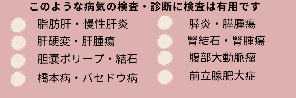 - 腹部エコー検査で色々な内臓の病気がわかります。